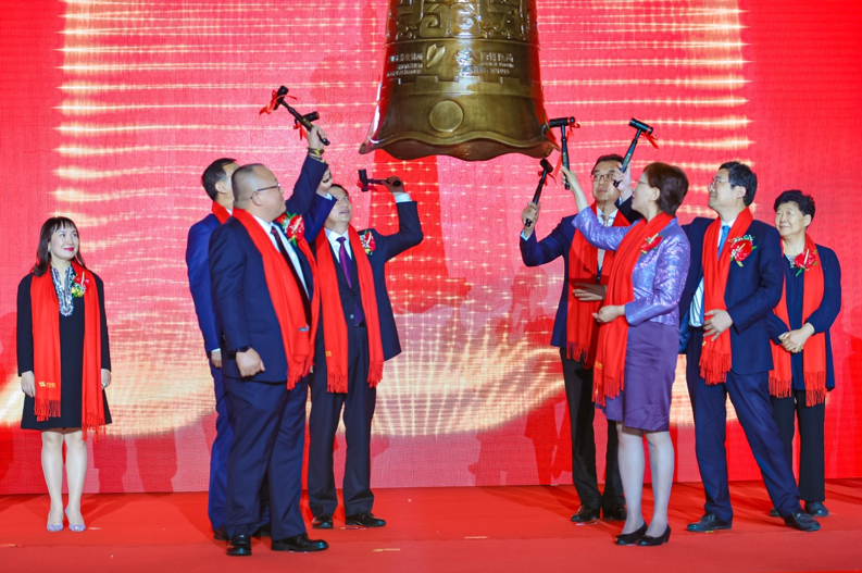 随后,在二十四位参加上市仪式的观礼嘉宾注视下,刘圣珍副主任、张军副市长、卞建平副主席、张新竹书记、王锦玉局长、付钢董事长一道,共同敲响了上市的宝钟。